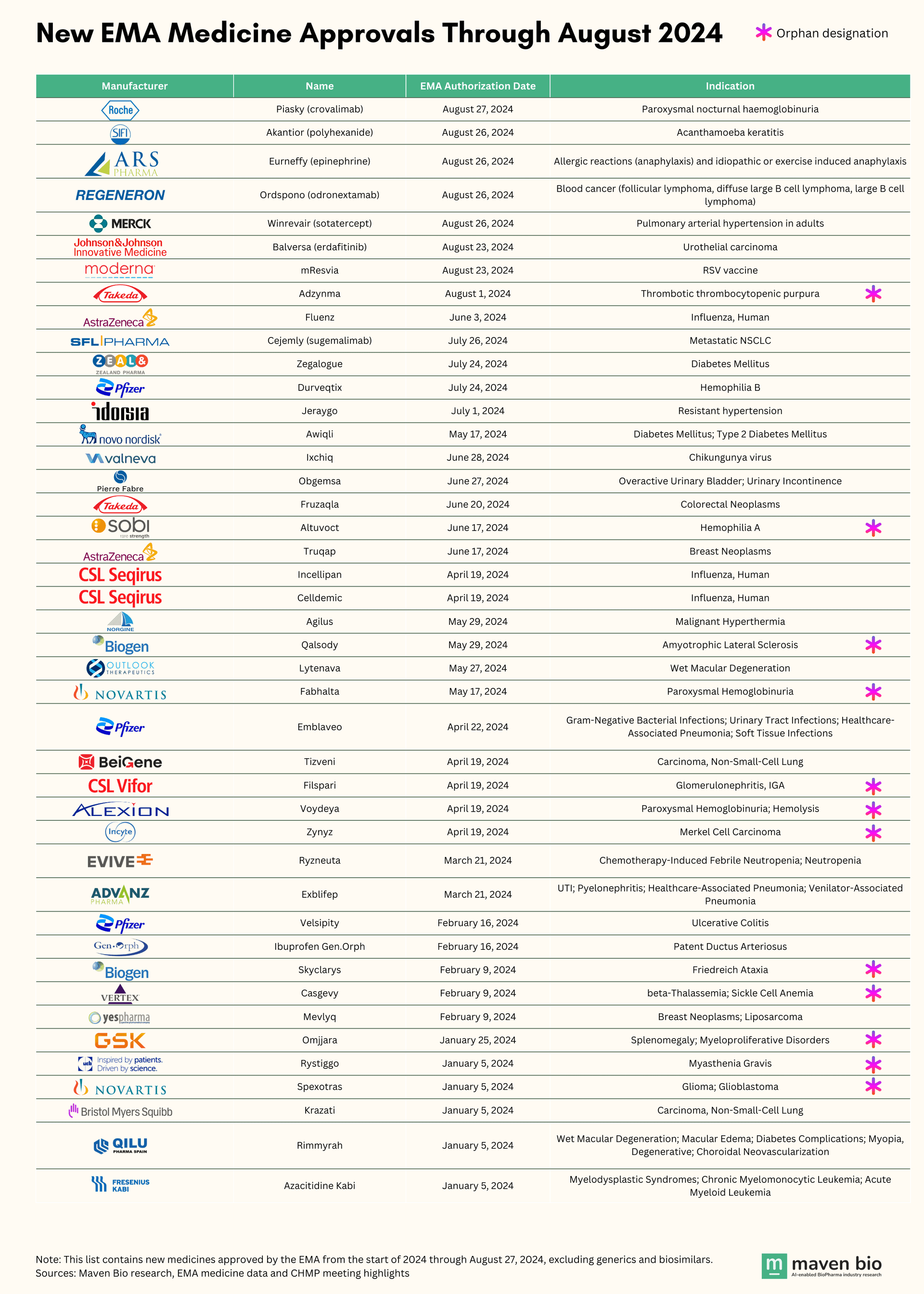 In the first eight months of 2024, the EMA approved 45 new drugs, matching the strong pace set in 2023 when a total of 77 new drugs were approved. Notably, 12 of the drugs approved this year have been granted orphan designation, securing 10 years of market exclusivity with additional incentives for small to medium-sized biopharma firms.