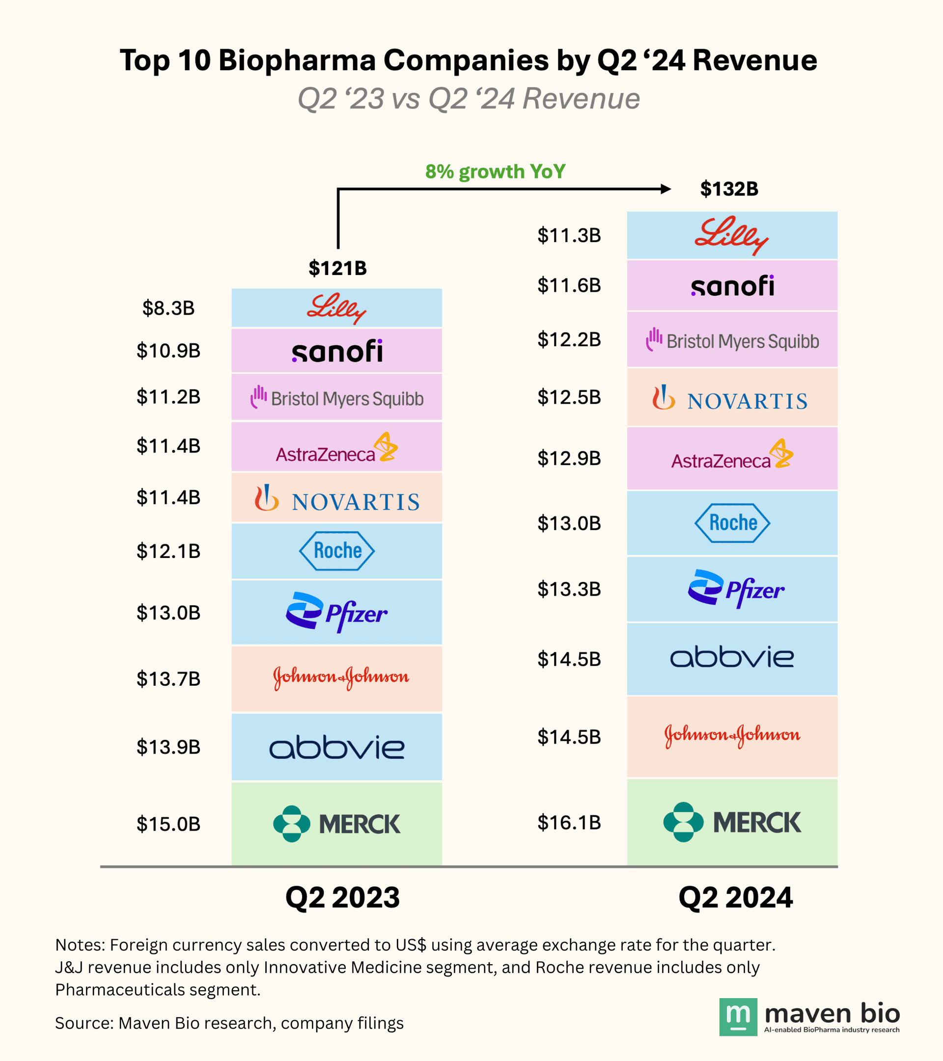 While not ranking among the top 10 biopharma companies by sales, Novo Nordisk and Amgen demonstrated impressive YoY growth trajectories in Q2.